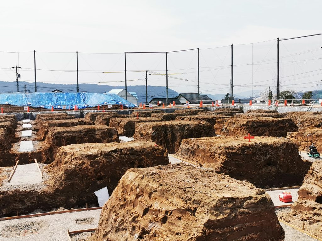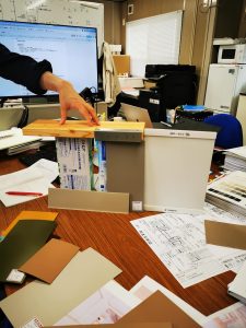 250417現場小屋にて。増築部の基礎工事と並行して、改修工事の仕上げ検討。各工事の進捗がばらばらのため、躯体形状も定まらぬなか、最初にトイレの仕上げを決める必要がある、というように、全体がこうだからここはこう、という判断ができない中での検討が続けられる。体育館では基礎工事が進む。発掘現場のよう。