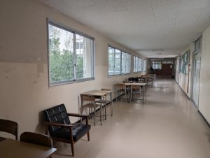 250502今回の改修、増築工事で各所に追加される予定のFLA(フレキシブル・ラーニング・エリア)。その予行演習といって、廊下に机を出したり、ソファを置いたり(学校が主体的に)。結構、お昼ごはんを食べたりしている模様。